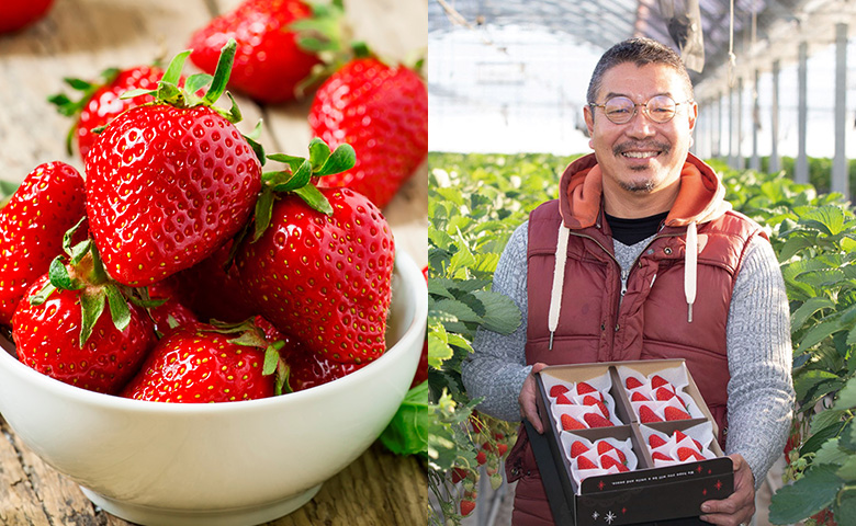 生產者藤尾純先生花費20年時間精心培育的「紅臉頰」士多啤梨,果肉呈現鮮豔的紅色,正是新春佳節的絕佳珍品。以最少的化學農藥,善用自然力量培育的果實,具有驚人濃郁的甜味和清爽的酸味特色。以熟練的眼光判斷「適熟」狀態進行收穫,因此每一顆都凝聚了芳醇的香氣和果汁。除了直接享用外,也推薦善用其美麗的橫切面,作為慶祝甜品的裝飾。