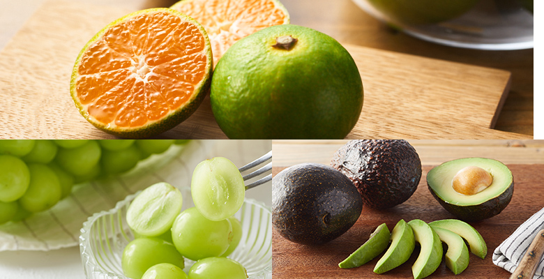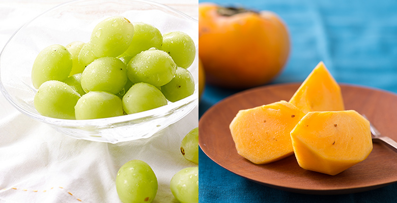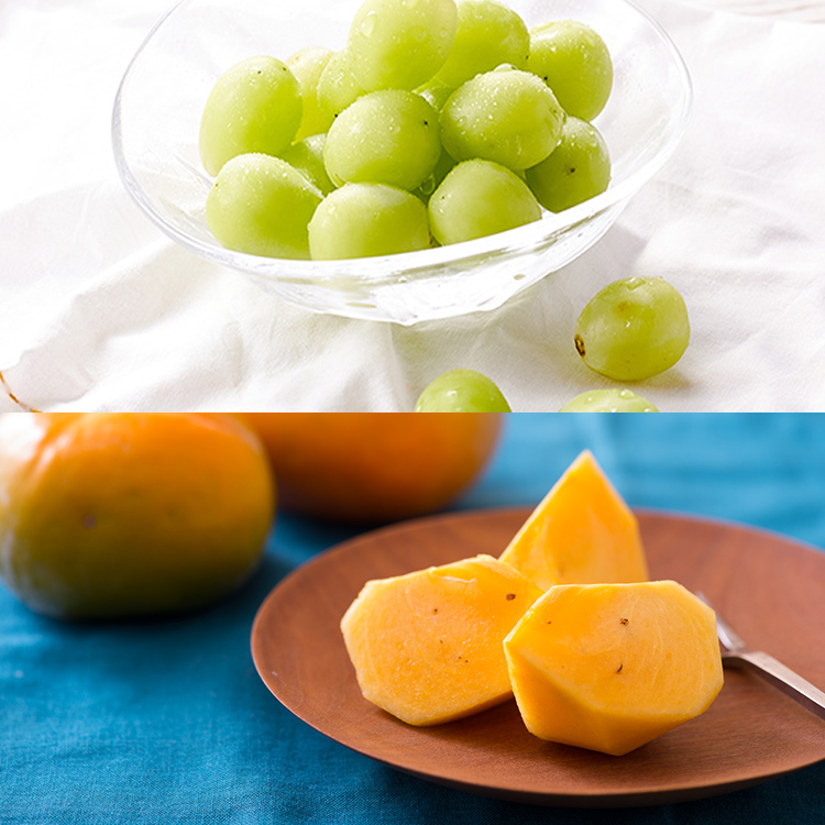 葡萄的女王、香甜多汁的陽光玫瑰葡萄。無籽柿一口咬下,如絲般的甜味在口中擴散,讓人感受到秋意漸濃的意境。