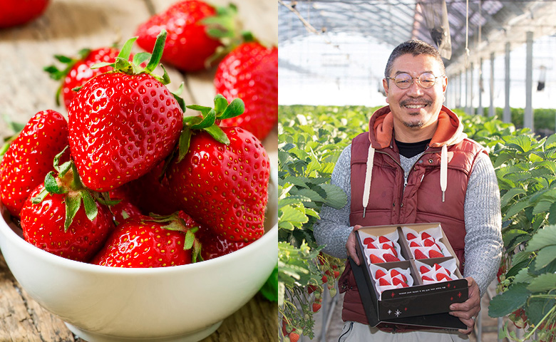純先生專注栽培士多啤梨20年。將溫室視為一個生態系統,借助微生物和天敵昆蟲的力量,將化學農藥使用降至最低,持續進行對自然和人類都友善的栽培。最大的堅持是以熟練的眼光判斷「適度成熟」時收穫。由於逐粒精選,無論任何大小都能品嚐到濃郁的甜味、清爽的酸味和豐富的果汁。連橫切面都呈現美麗的紅色,與鮮忌廉的搭配也絕佳。食用前回復至常溫,能更加突出其本來的香氣。