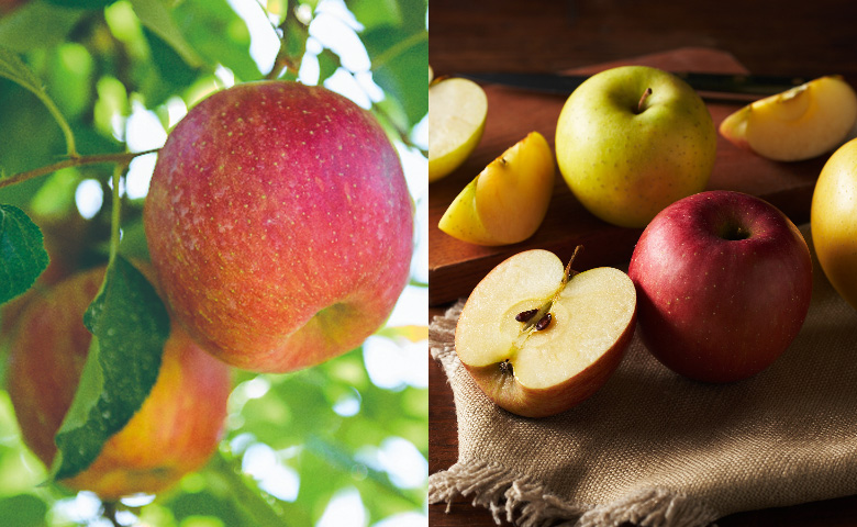 為了最大限度地發揮蘋果本來的美味,特意堅持「不摘葉」栽培的「富士」和「王林」蘋果。通過將葉子保留到最後來促進光合作用,讓果實充分積蓄養分。甜味和酸味平衡絕佳,爽脆口感令人愉悅的「富士」。以及酸味較少,滿口擴散的濃郁甜味和華麗香氣極具魅力的「王林」。在葉子遮擋下難以上色的情況下,不惜工夫,實現了外觀美麗與內在充實的兼顧。請務必品嚐比較各自個性突出的濃郁味道。