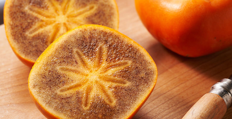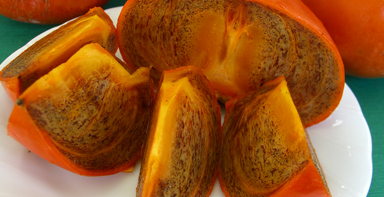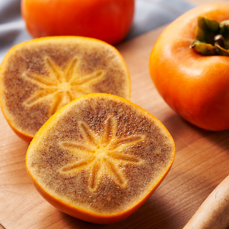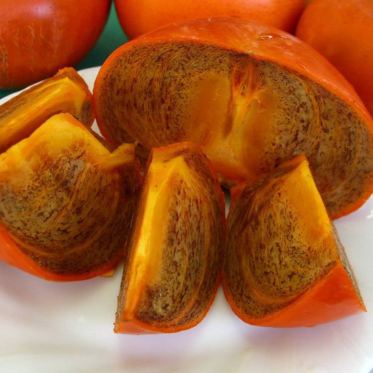 這種柿子最大的特色,是透過樹上慢慢脫澀而呈現的黑色斑點,俗稱「黑芝麻花紋」。這是澀味成分單寧固化的現象,是甜味充分積累的完熟證明。切面上展現的美麗芝麻花紋,證實了脫澀的成功。