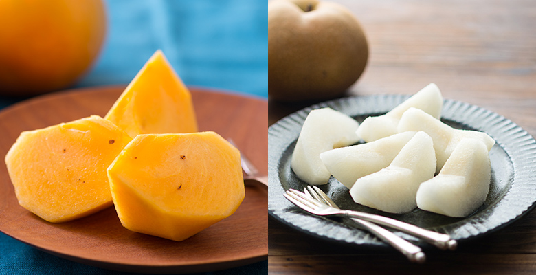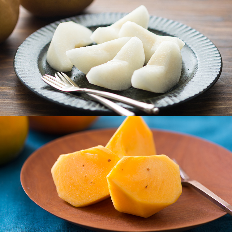 無核柿子沒有果核,方便享用,特色是入口即化的質感和濃郁卻優雅的甜味。「南水」梨的特點是「濃郁的甜味」和「爽脆的口感」,果汁多、酸味少,因此可以充分享受到它的甜美。不僅可以直接作為甜品享用,梨子也可作為沙律的點綴。