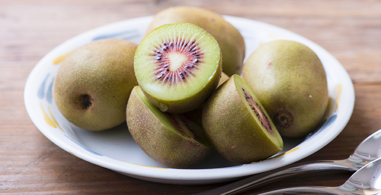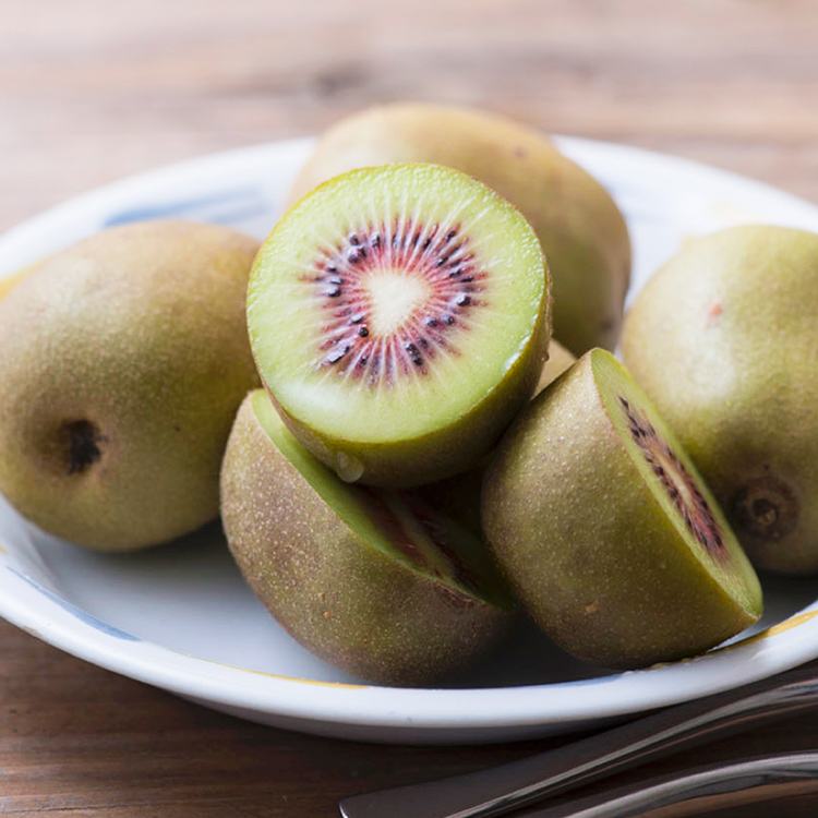 略帶紅色的小粒奇異果,其特色在於美麗的果肉色澤和極強的甜味。由於酸味較少,也推薦給不喜歡奇異果酸味的人士。