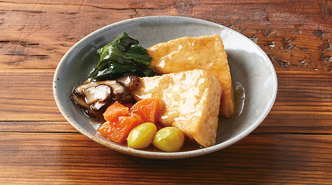 食材:厚炸豆腐 1塊、冬菇 3-4個、小松菜 1束、紅蘿蔔 1/2條、白果 8-10粒 高湯 300毫升、生抽・味醂 各2湯匙、砂糖 1茶匙、料酒 1湯匙