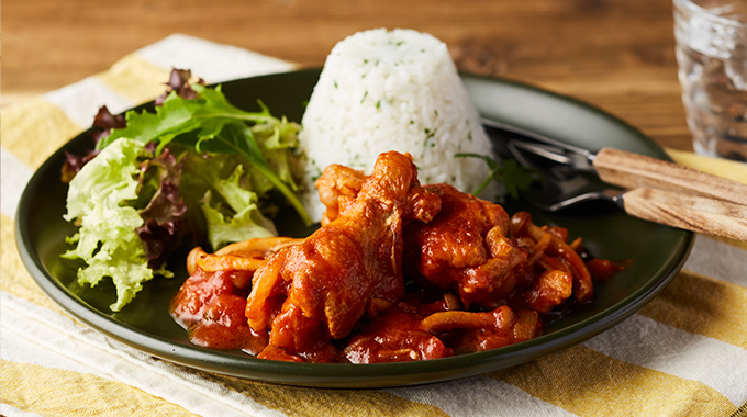 食材:雞鎚或雞髀肉 300克、洋蔥 1個、甜椒(紅、黃) 各1/2個、車厘茄 10-12個 番茄罐頭 1罐、雞湯塊 1個、茄汁 2湯匙、鹽胡椒 適量 白飯 2碗分量、沙律菜 適量、橄欖油 1湯匙