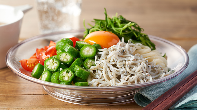 步驟4. 將烏冬盛在器皿中,將調理好的蔬菜、車厘茄、白飯魚色彩豐富地擺放。在中央放上蛋黃,淋上醬汁即完成。