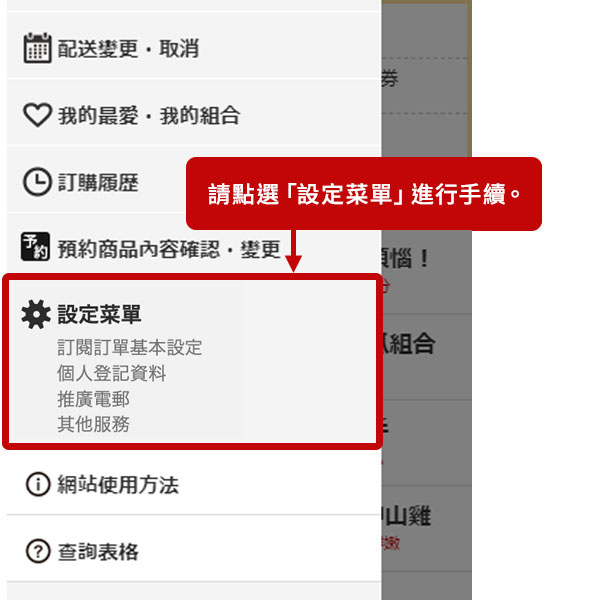 確認或更改訂單送貨頻度時,請於登入後點選「我的帳戶」中「會員資料」,再選擇「會員基本資料」及「電郵地址」進行確認・更改手續。