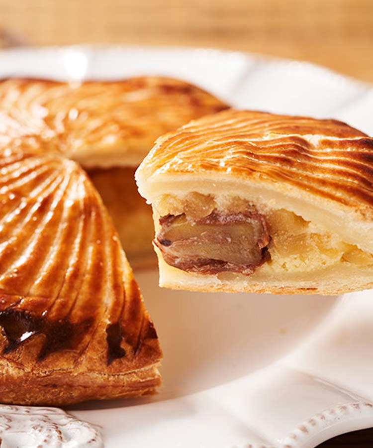 奢侈的使用大量牛油製作餅皮,再包入杏仁Cream和蘋果,酥脆的撻皮配上濕潤的內餡,是十分濃厚的法式甜品。我們用栗子取代了陶瓷玩具,食到栗子的人將是未來一年的幸運兒!家中聚餐必備的好味又好玩的賀年甜品,請務必一試!