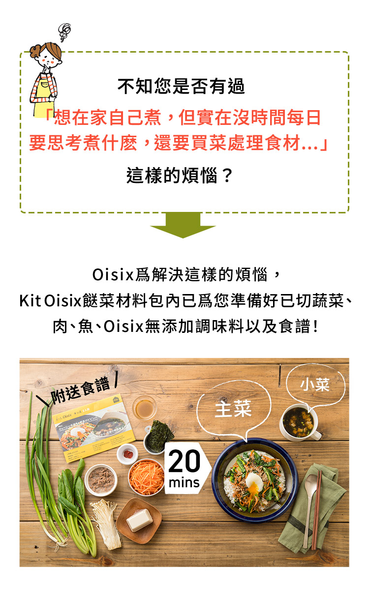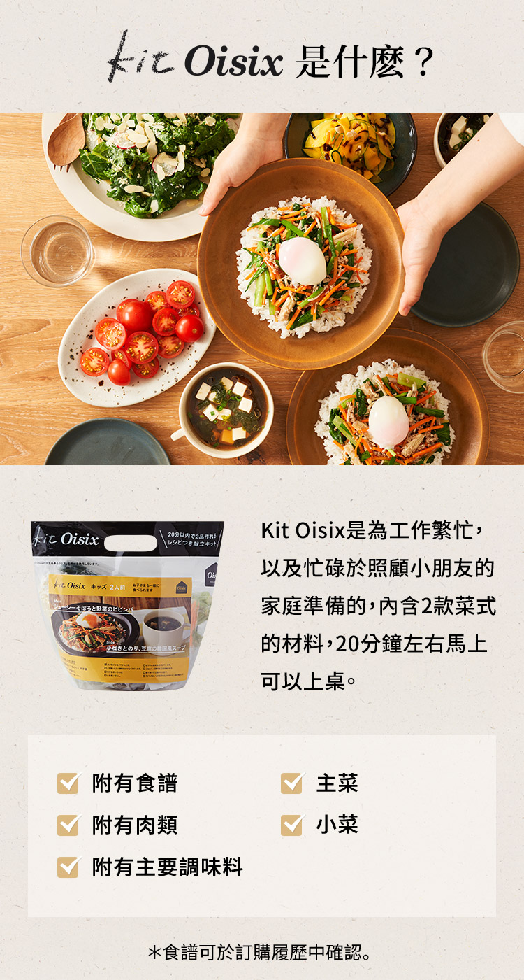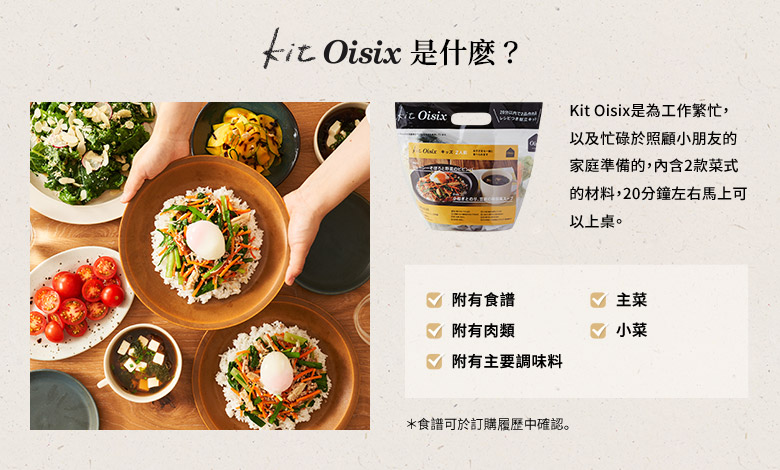 在Kit Oisix組合内一應俱全提供蔬菜、肉類或魚類、調味料、食譜。具體內容請參閱相關食譜和商品的詳細頁面。