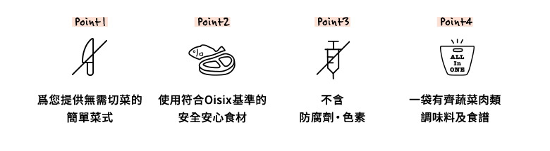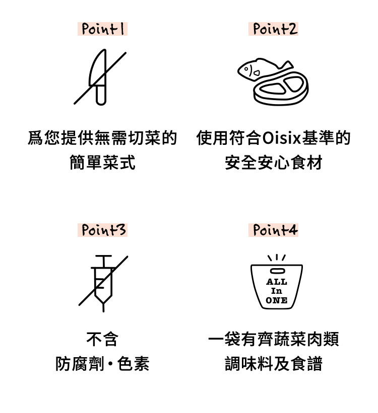 有關Oisix所提供的加工食品的添加物,不使用合成防腐劑和合成色素,原則上使用天然的調味料作調味處理,以保留和帶出食材原有的味道。詳細請參閱食物安心宣言頁面。 食物安心宣言頁面