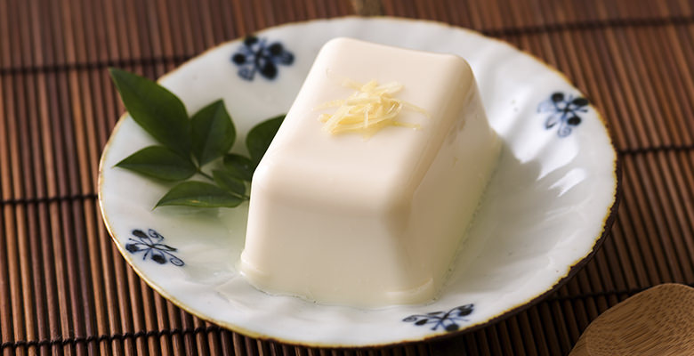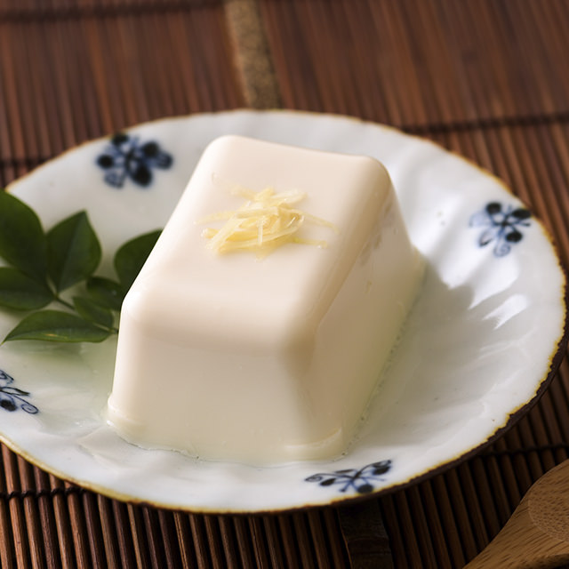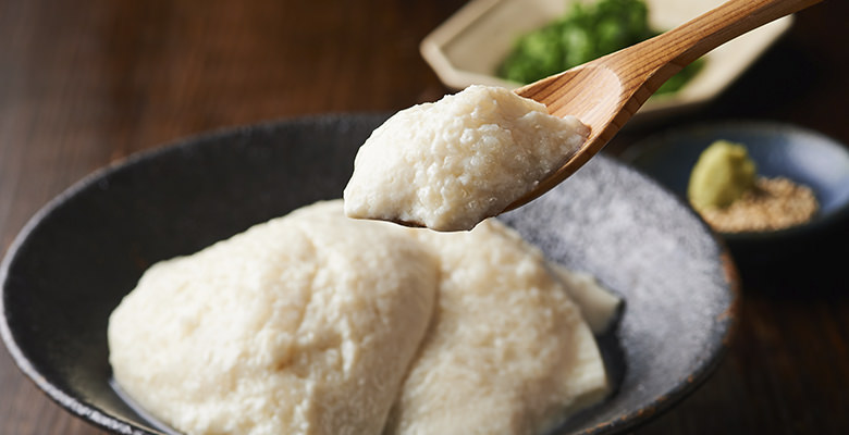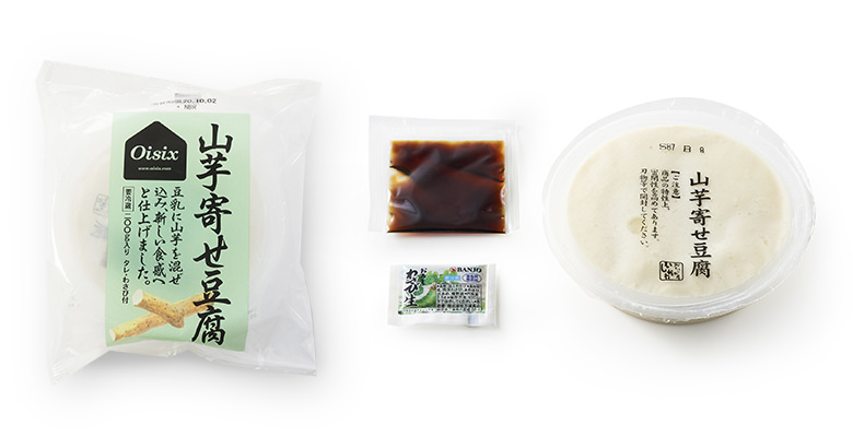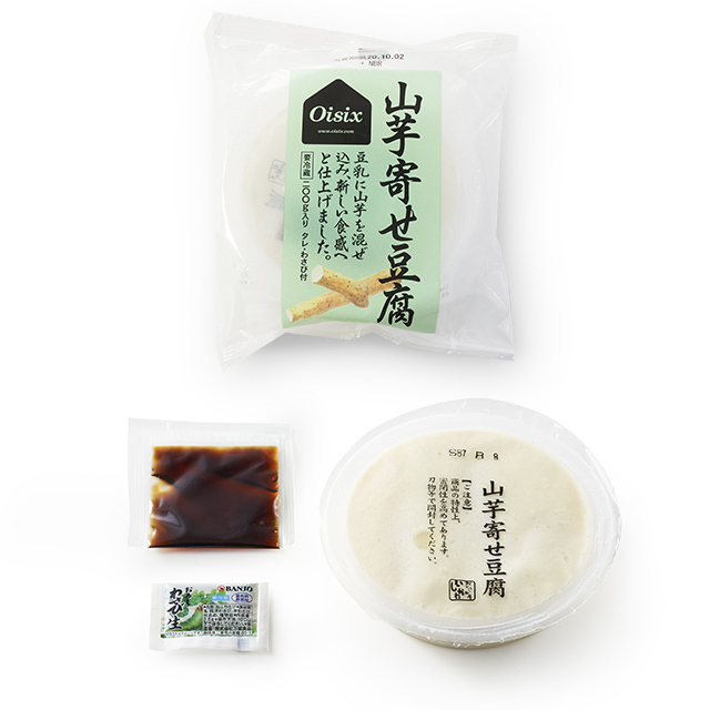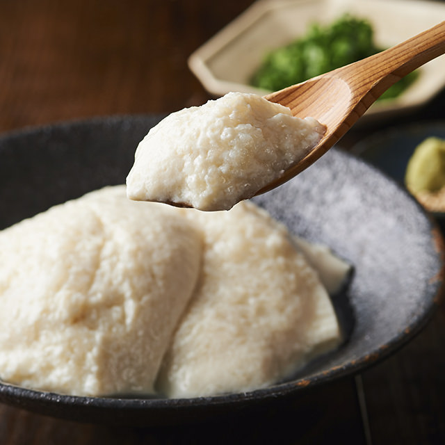 在日本國產大豆豆乳中加入山芋泥,山芋爽口黏稠質感,配上軟滑豆腐,同時享受兩種不同口感。加上附送的醬汁和芥末,品嚐美味的涼伴山芋豆腐。