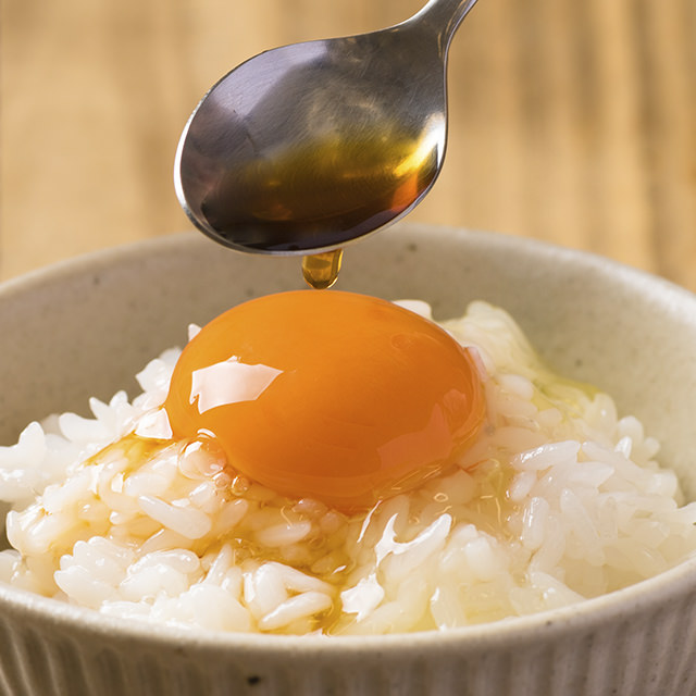 使用富士山麓的深層水製作的雞蛋,濃厚的蛋黃口感軟綿,淋上醬油,製成簡單雞蛋拌飯。