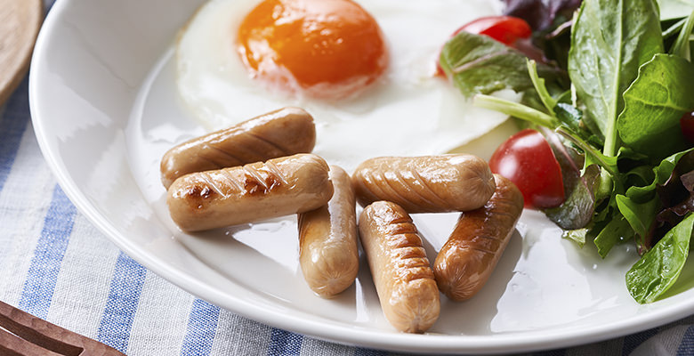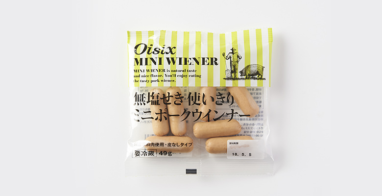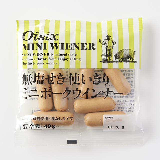 使用無冷凍新解豚肉製成的迷你維也納香腸,無添加發色劑、合成保存劑、合成着色劑,加入食鹽、砂糖、香辛料腌製出風味醇厚香腸,1袋約49g,剛好能一次用完的份量。