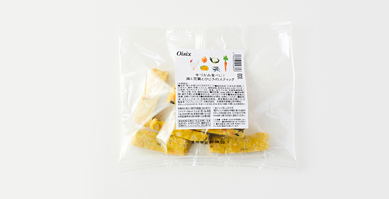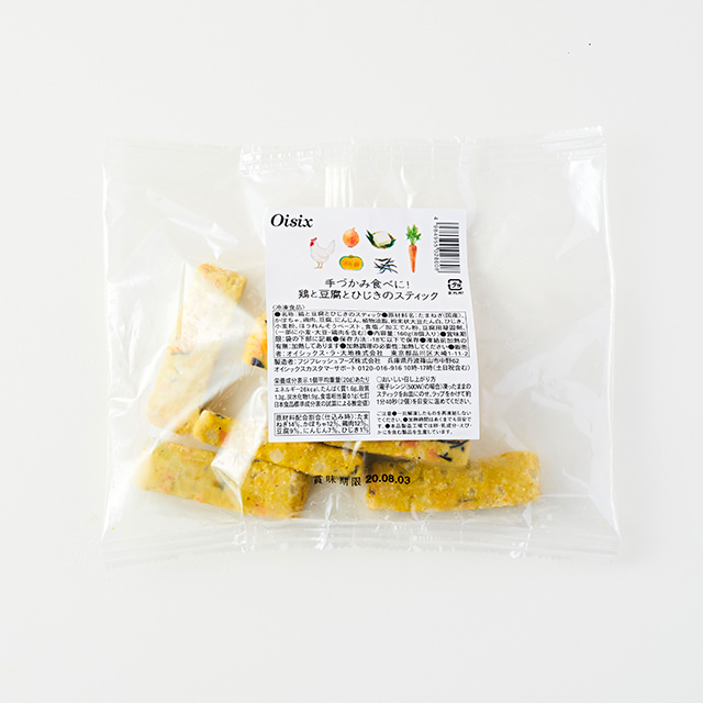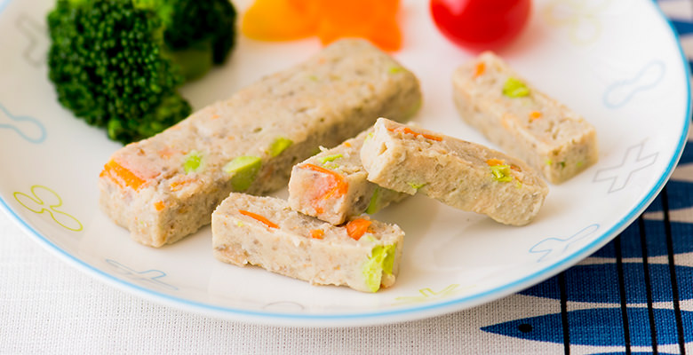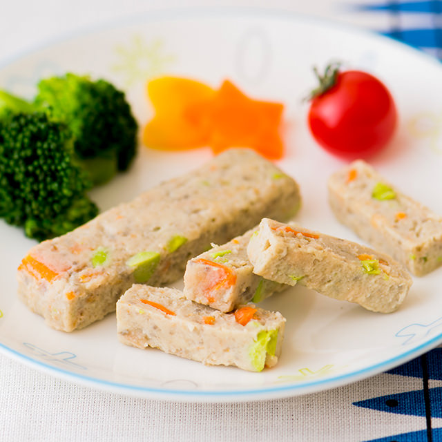 鹽分低同時能攝取蔬菜成份且口感柔軟的簡單小吃。在雞肉和豆腐中加入南瓜、洋蔥、紅蘿蔔、羊栖菜蒸煮而成的蔬菜棒,沒有使用加工澱粉,以微波爐簡單加熱即可食用。