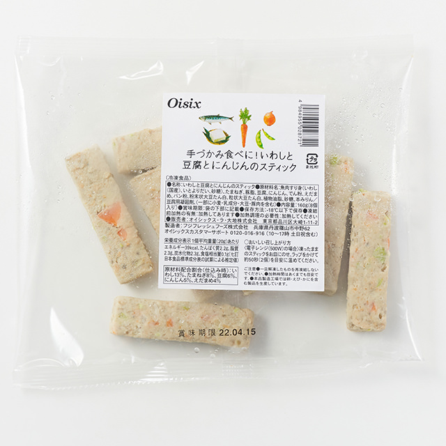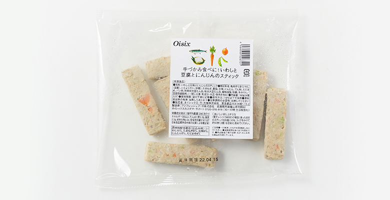 鹽分低同時能攝取蔬菜成份且口感柔軟的簡單小吃。在沙甸魚的魚蓉加入豆腐、洋蔥、紅蘿蔔、枝豆蒸煮而成的蔬菜棒,沒有使用加工澱粉,以微波爐簡單加熱即可食用。