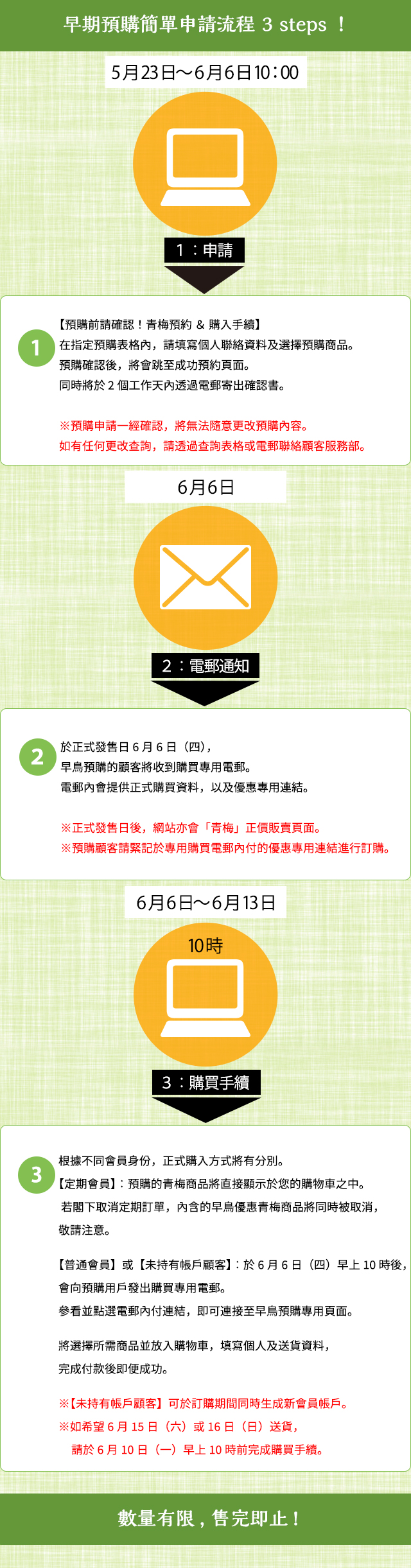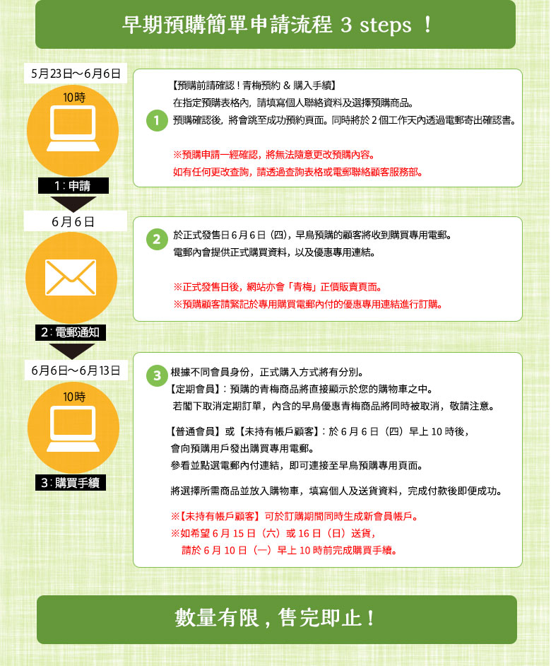 ※為同時配合青梅合適收成日子,本次「青梅特集」內提供的商品送貨日有可能更改,敬請理解。
