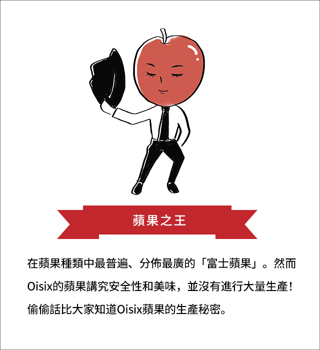 正因為Oisix使用有機肥料而並非使用單獨控制氮含量的化學肥料。因此,蘋果的產量比一般較少,而影響到商品的價格。雖然價格偏貴,但著重安全,能夠防止蟲害和疾病的發生,亦因為減少使用農藥的關係,種植出可以連皮一同食用的蘋果。
