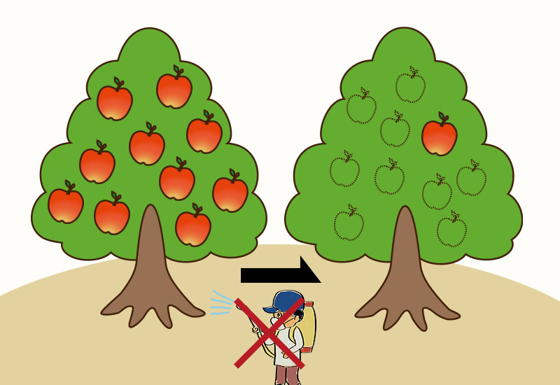大量保留樹葉(不摘除樹葉),將剩餘的果實減少到正常數量的一半。