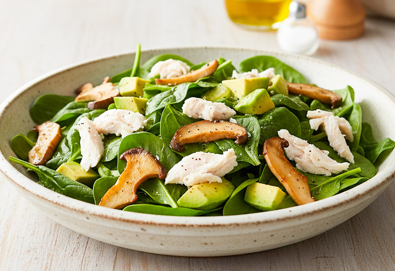 採用含豐富鐵質的菠菜、優質蛋白質的雞柳、高纖維的杏鮑菇,以及有「營養之王」美譽的牛油果。 這一碟已能為您提供完美均衡的營養。 推薦配搭清爽的法式沙律醬或橄欖油沙律醬!
