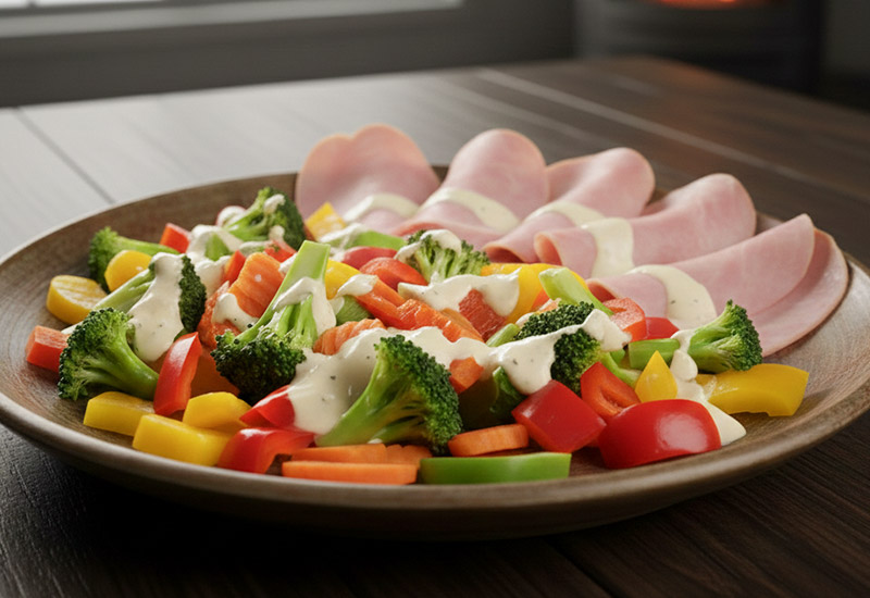 在寒冷的季節,來一份溫暖的蒸蔬菜配上火腿片的沙拉怎麼樣?蒸煮後的西蘭花和紅蘿蔔更能帶出甜味,讓身體從內而外暖和起來。此外,紅、黃甜椒的鮮豔色彩讓餐桌增添亮麗,同時補充了容易不足的維生素!這款繽紛暖沙拉搭配了濃郁的忌廉醬,火腿的鹹香與之完美結合,是一道賞心悅目的冬季沙拉。營養豐富,為您在寒冬中注入活力!