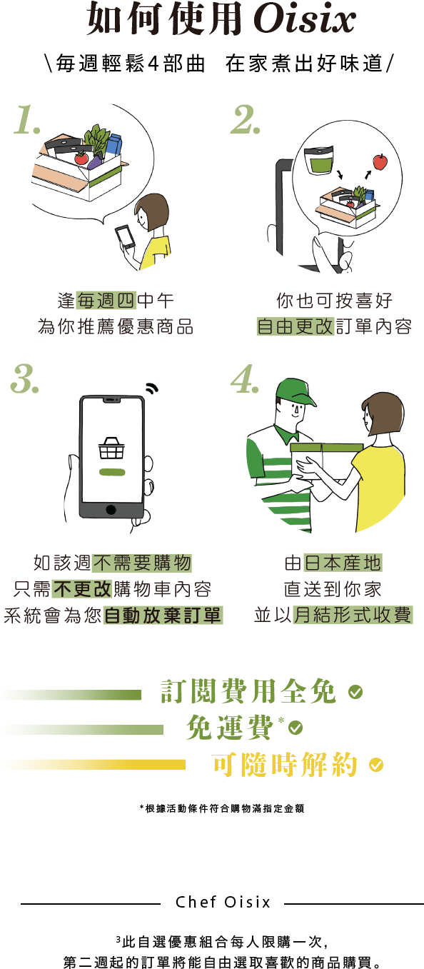・第二至第四星期:單次購物滿 HK$450 可享免運費(如第二週,第三週購買Chef Oisix指定商品組合更即可免運。)
