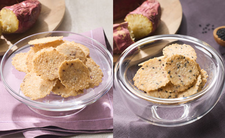以日本國產烤番薯製成,將其壓碎後直接揉入餅底,分別加入沖繩黑糖及黑芝麻調味,保留烤番薯原有的香甜與焦香。口感接近芋條般的硬脆咬感,2–3 公分大小方便食用。