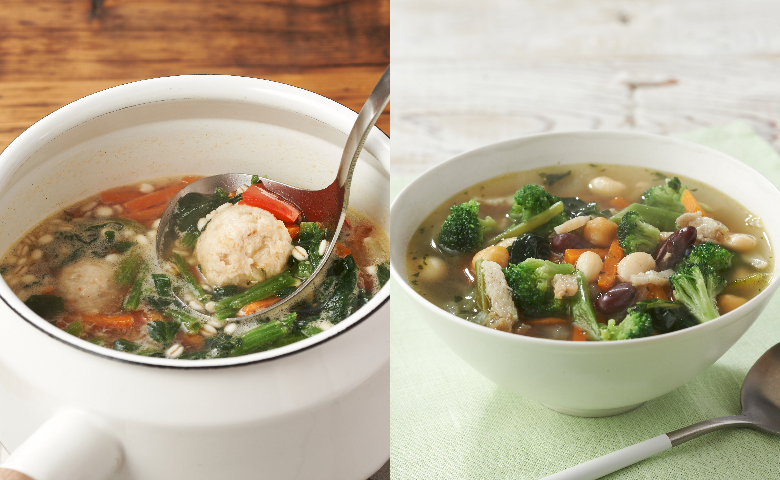 一鍋即可完成的飽足系蔬菜湯,輕鬆享受豐富營養。和風生薑湯以鰹昆布高湯為底,配上5款蔬菜、雞肉丸與大麥,生薑香氣温暖身心;洋風綠蔬雞湯則以法國鄉村風為靈感,集合4款蔬菜、3色豆與無添加煙肉,更加入小球藻粉呈自然綠色,蔬菜充分吸收雞湯旨味。兩款皆可按喜好加菇類或豆腐提升滿足感,健康美味、暖胃又飽肚。