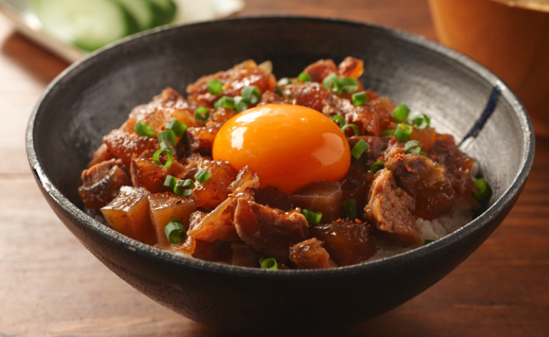 熱騰騰的白飯上鋪滿柔嫩入味的牛筋與蒟蒻,淋上滷汁後再加上一顆半熟蛋。濃郁的蛋黃與醬油香氣融合,入口瞬間化開。撒上少許蔥花與七味粉,就是簡單又奢華的居酒屋風丼飯。