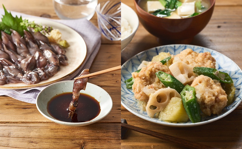 組合的核心是刺身等級的「螢光烏賊」,入口後即刻散發出濃郁且甘甜的內臟旨味,是識食的饕客絕對不能錯過的當季鮮美。搭配只需微波加熱即可享用的「雞肉唐揚炸雞與烤茄子蘿蔔泥煮」,酥脆雞塊與吸飽湯汁的嫩滑燒茄子,在清爽的蘿蔔泥中展現出溫潤的和風層次。這份兼具「鮮冷刺身」與「暖胃煮物」的完美組合,不僅節省了繁瑣的料理時間,更為您的晚間小酌增添了一份職人等級的精緻質感,是犒賞辛勞一天的最佳選品。