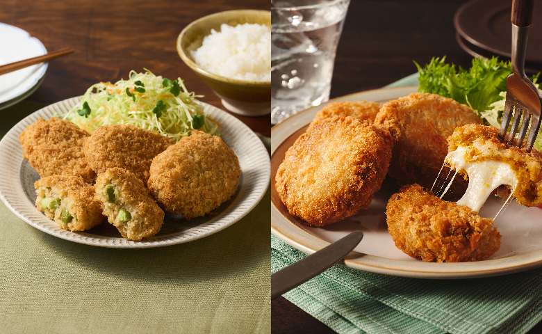 從清甜的南瓜泥中,濃郁芝士呈拉絲狀流出,外脆內軟的口感令小朋友也愛不釋手。另一款則選用在雪室熟成以增加甜度的薯仔,並拌入香氣濃郁的「茶豆」。請盡情品嚐並對比這兩款薯餅的獨特風味。兩款均已預先炸好,只需加熱即可完成。
