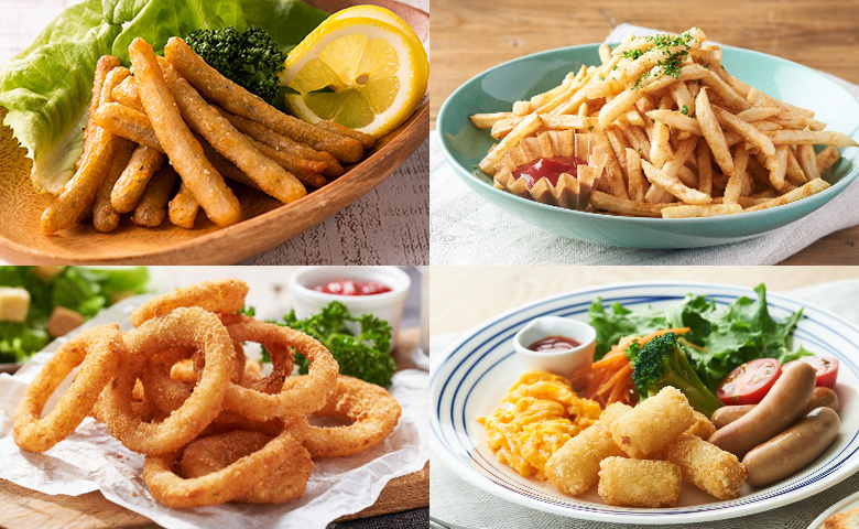 味道濃郁且口感極佳的炸牛蒡;份量十足、極具飽腹感的薯條及薯餅;以及香氣誘人的洋蔥圈。作為主菜的伴菜亦大派用場!